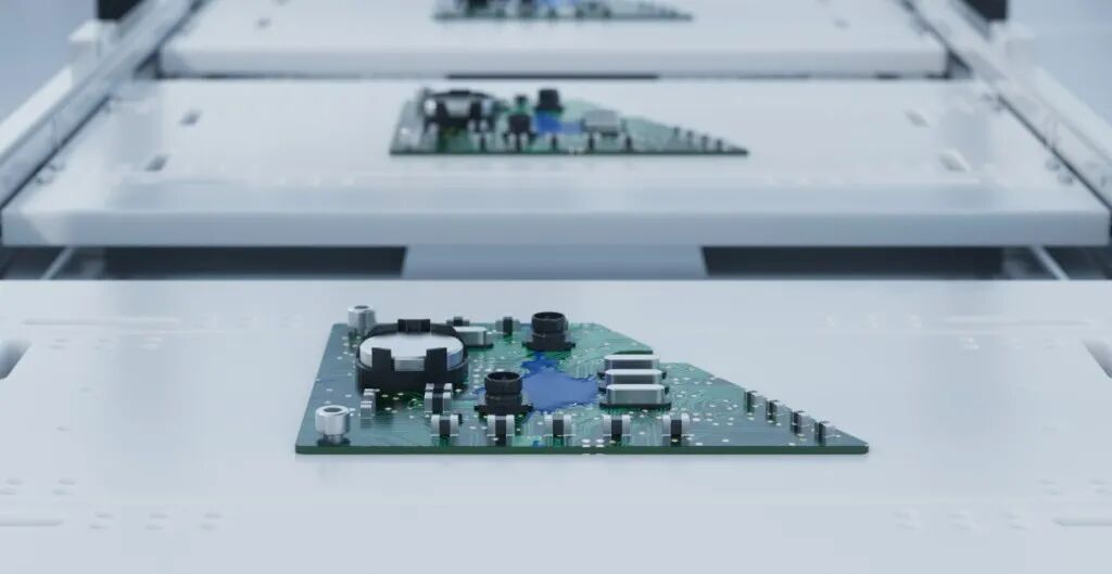 • Precise positioning of critical areas: After coating and curing, the PCB is guided by a vision positioning system. The sensor is directed to 5 to 9 predefined measurement points. These points are selected based on failure analysis, focusing on high-risk areas like chip edges and connector pins.