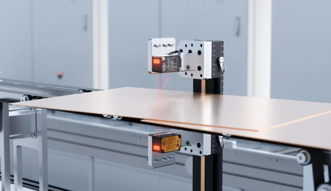 在检测PCB板多层重叠时,将一对SD-C030激光位移传感器对射安装在PCB板生产线的自动送料机上,使其激光束垂直照射在PCB板上。当PCB板通过滚轮运动经过检测区域,上、下传感头以5μm高精度检测能力和1kHz高采样频率实时采集PCB板表面的厚度数据,通过RS485或模拟量传输至上位机,判断产品是否重叠。