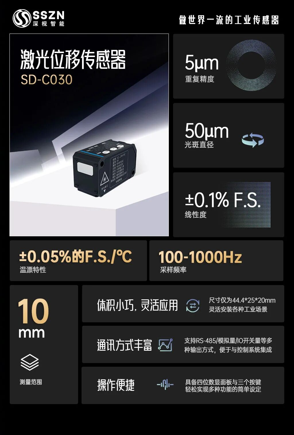 深视智能SD-C030激光位移传感器的检测距离为30mm,量程为±5mm,采样频率为100-1000Hz,线性度为±0.1%的F.S.,光点直径为Φ50μm。此外,它还支持RS-485通讯、模拟量电压/电流输出等多种通讯方式,方便与上位机进行数据交互。