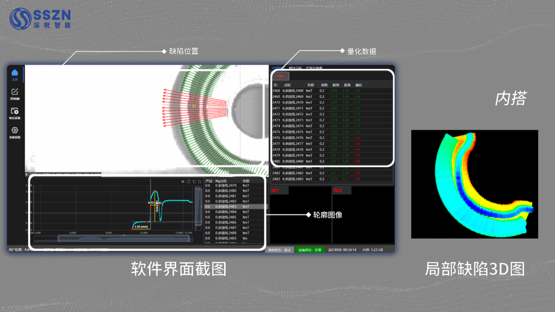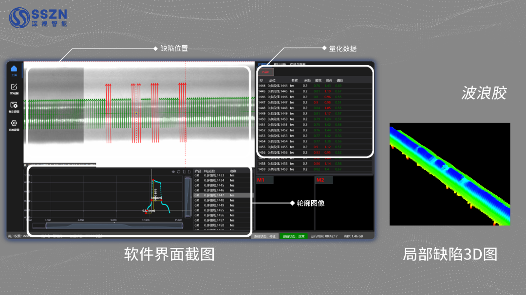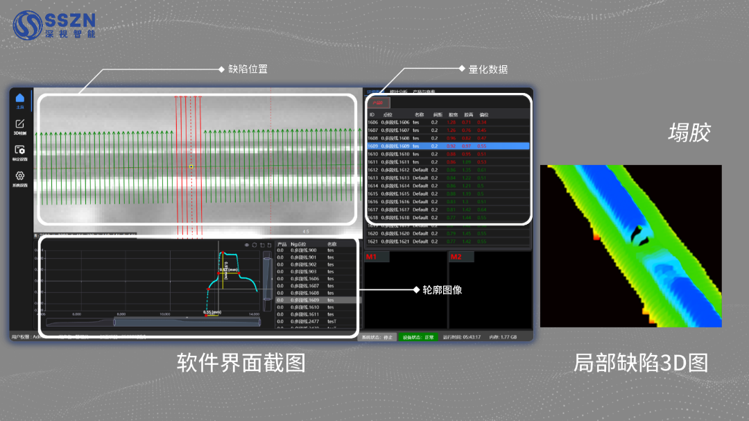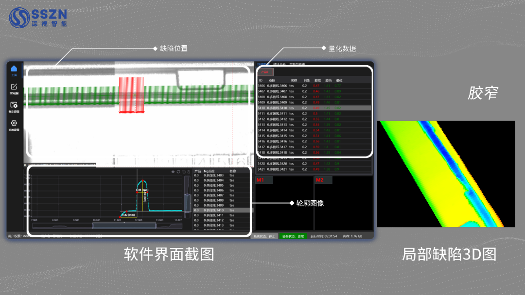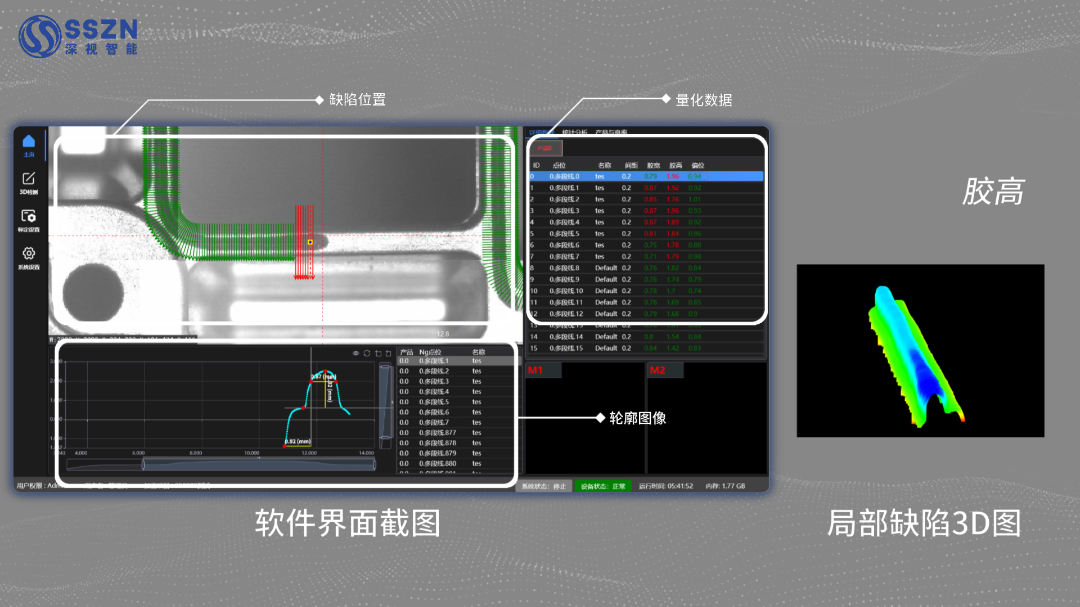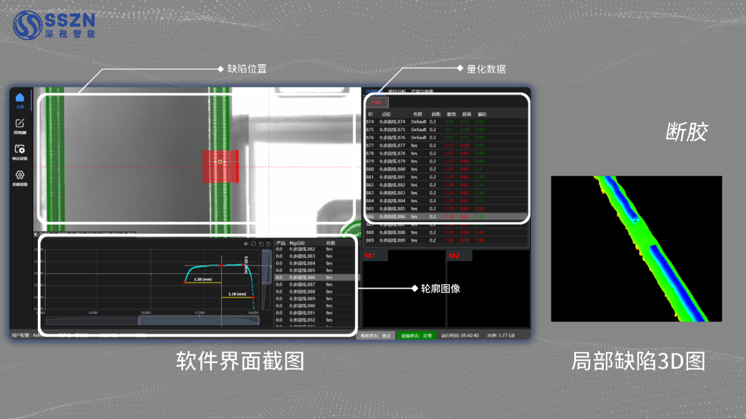 On the main interface, the system accurately associates and synchronously displays defect locations, precise quantitative data (such as glue height and width), and 2D/3D profile images. Using color-mapped heatmaps, the distribution and severity of various defects — including broken glue, overflow, and narrow glue — are clearly visible. On-site personnel can quickly complete defect positioning, qualitative analysis, and severity assessment without repeated comparison across multiple images.